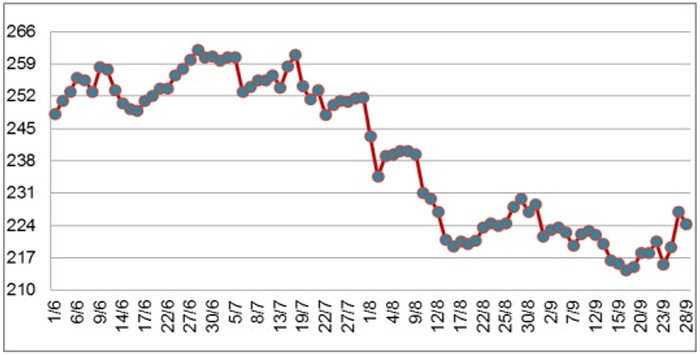 Tại Sở giao dịch hàng hóa Osaka Exchange (OSE) Nhật Bản giá cao su RSS3 biến động sau khi giảm xuống mức 214,4 Yên/kg vào ngày 16/9, có xu hướng tăng trở lại. Cuối tháng 9, giá cao su RSS3 giao kỳ hạn gần ở mức 224,3 Yên/kg (1,55 USD/kg), giảm 1,8% so với cuối tháng trước, nhưng tăng 14% so với cùng kỳ năm ngoái.