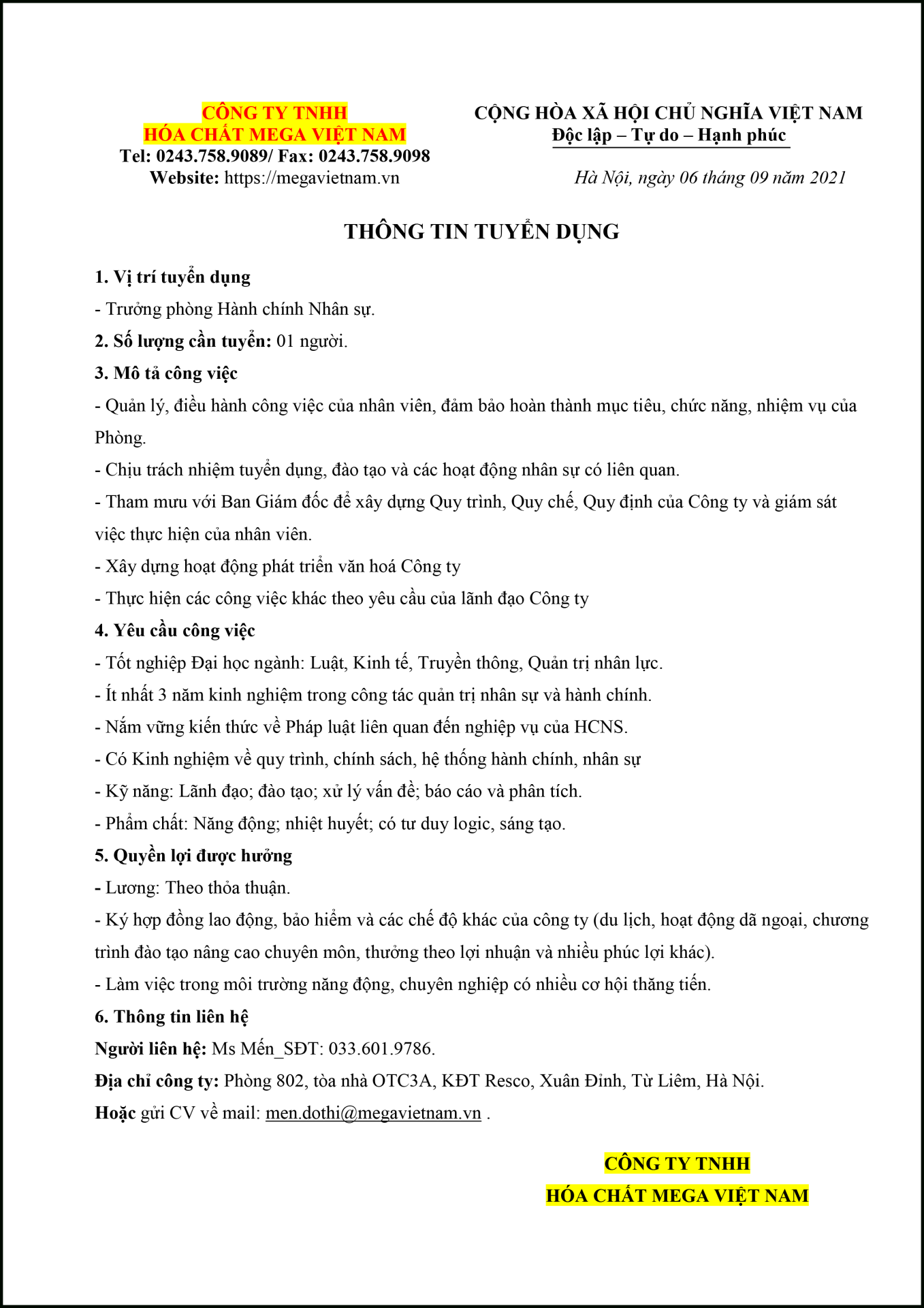 THÔNG TIN TUYỂN DỤNG - TRƯỞNG PHÒNG HÀNH CHÍNH NHÂN SỰ